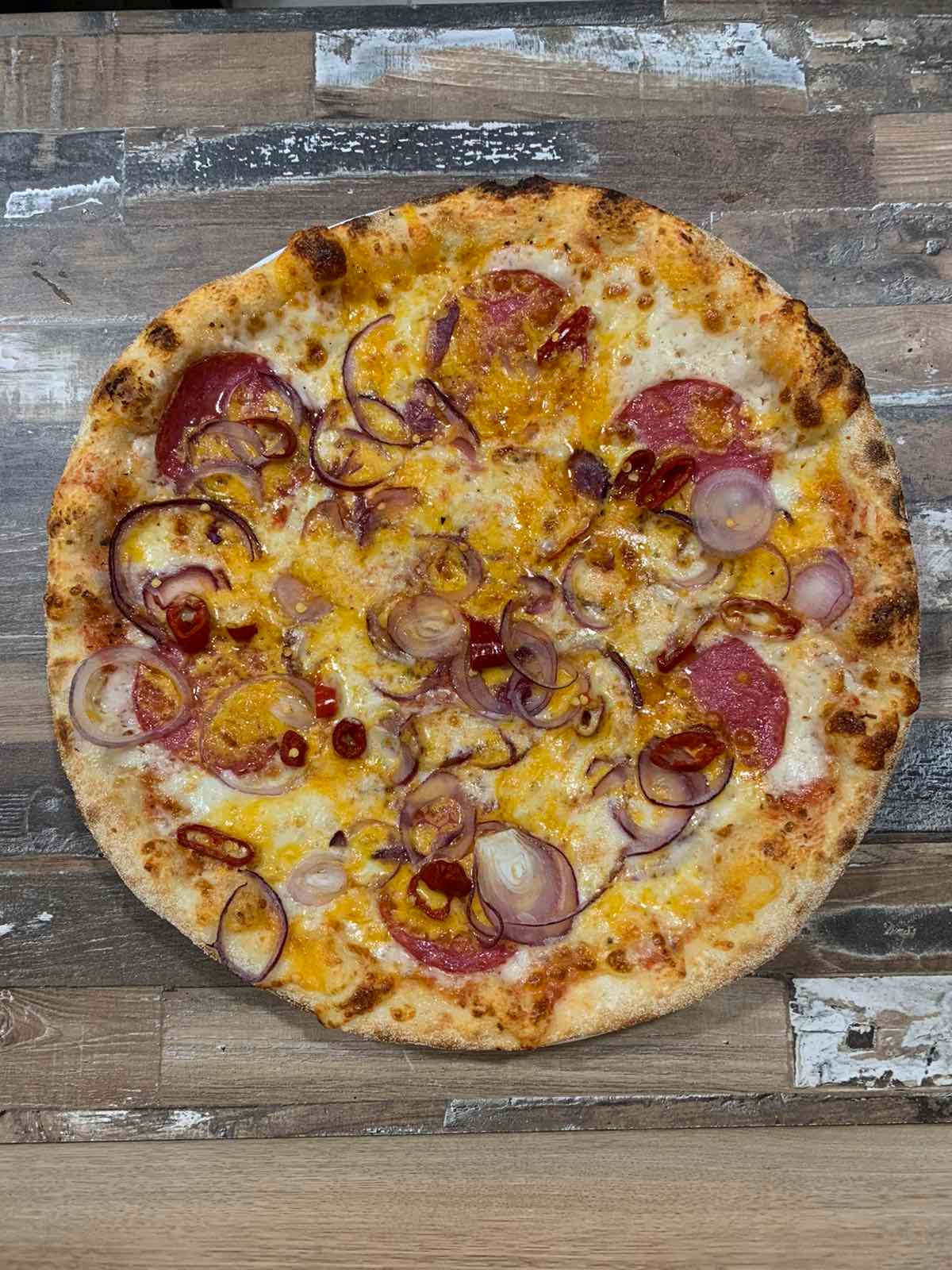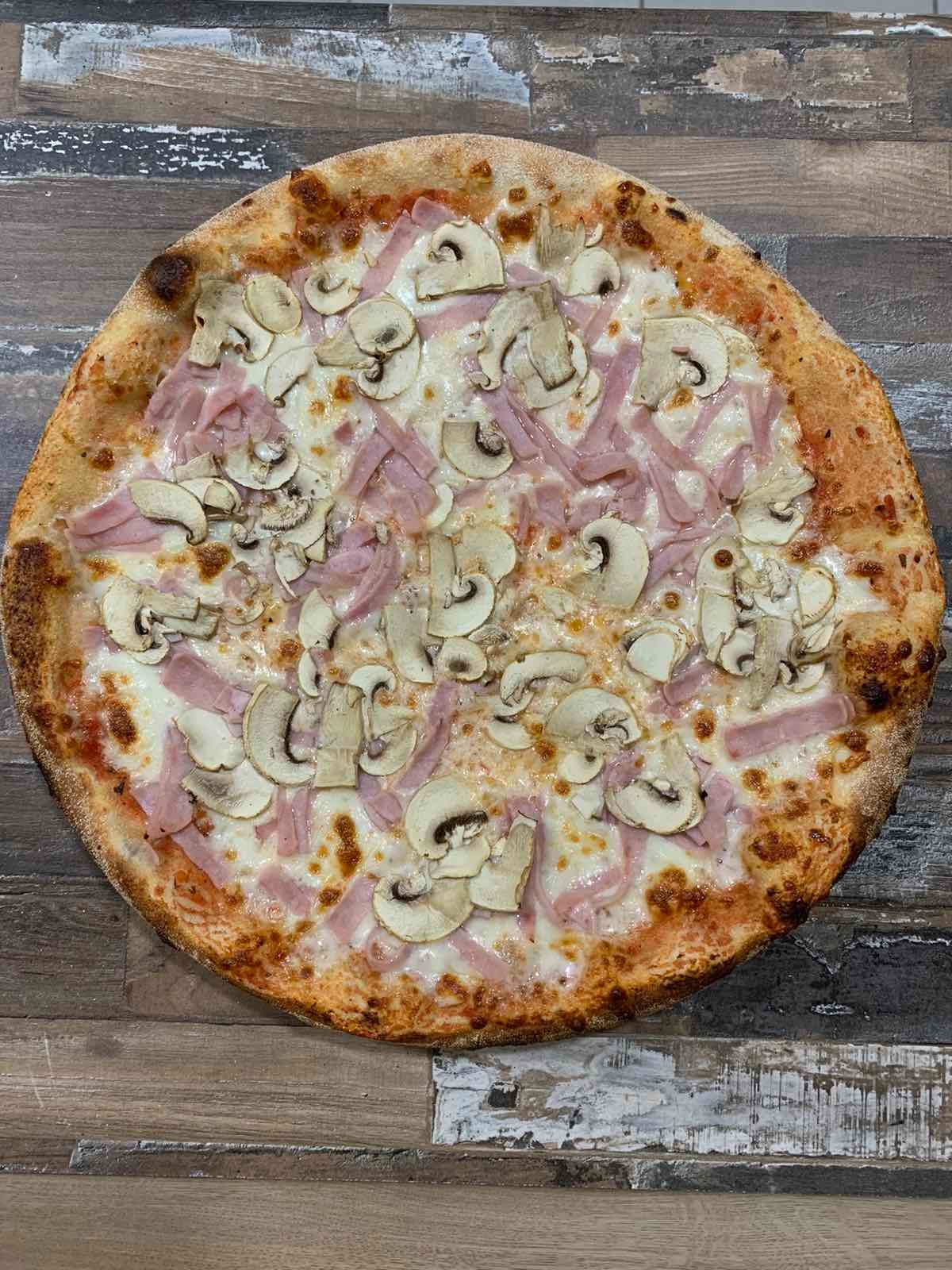 tomat, mozzarella, cibuľa, feferóny, šampiňóny, capari, prosciuto -